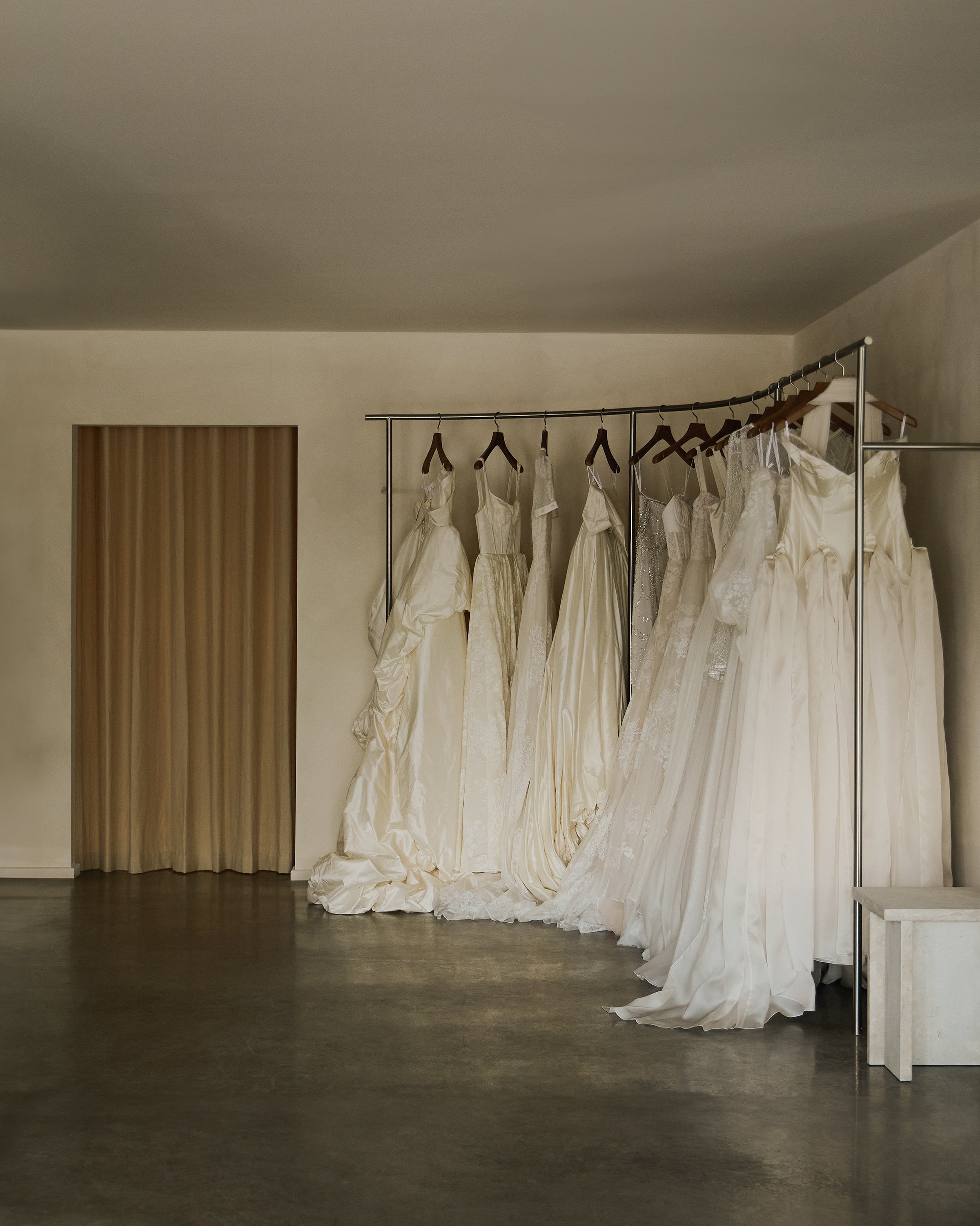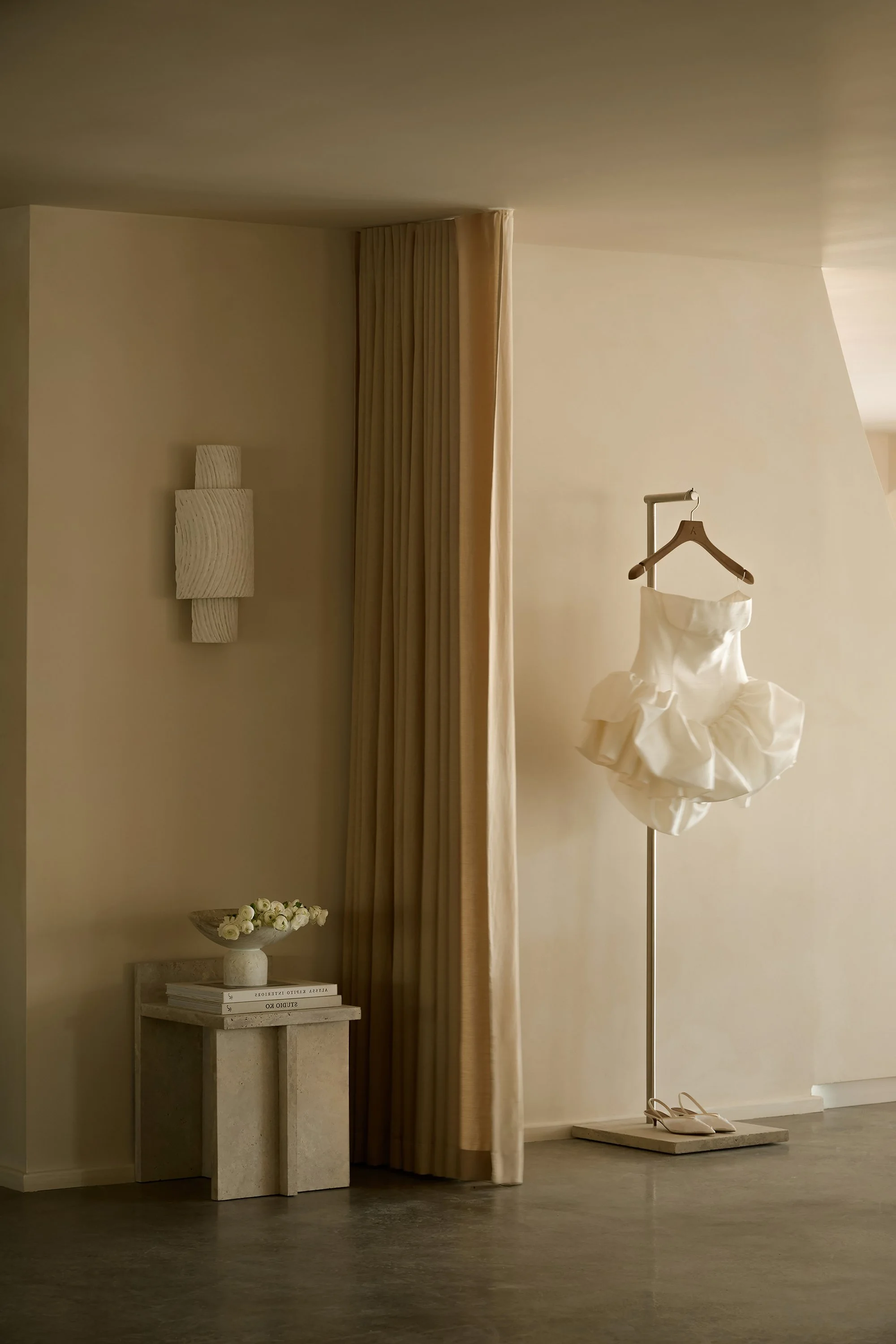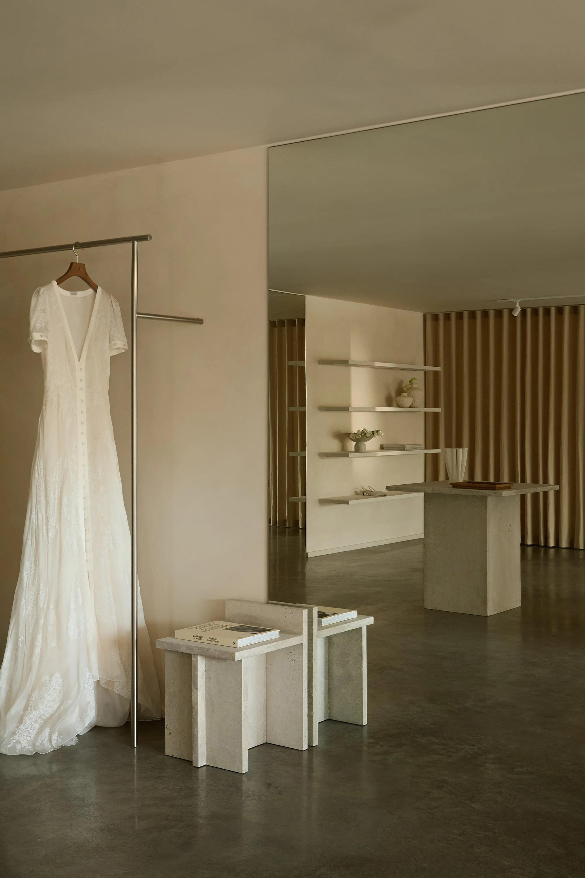 Stepping into the new Amare studio feels like entering a world shaped by intention. Founded by Lyndsey Gibbons and designed in collaboration with Hannah of Hannah Llewlyn Interiors, the space reflects both the brand’s journey and its future. It carries the same sense of calm and warmth that brides have always known, now layered with quiet sophistication and renewed energy. The studio was envisioned as both a sanctuary where brides can slow down and connect, and a gallery where each gown is elevated as a work of art, its craftsmanship and texture allowed to shine. Light drifts across polished concrete floors, mingling with the soft fragrance of seasonal blooms. Antique furnishings and natural stone ground the space, while gowns are displayed with care so that every fabric, texture, and detail is illuminated to perfection. Every corner has been thoughtfully considered to guide brides through a seamless and reflective journey, with mirrors positioned for effortless fittings and rooms arranged to encourage stillness and discovery. Music sets a gentle rhythm, Champagne marks the moment, and the design itself ensures each bride feels both celebrated and at ease. “We wanted a space where brides feel inspired and deeply seen,” Lyndsey shares, “a place that holds calm and elegance, but also the intimacy of something personal.” The curated edit reflects this philosophy, with designers such as J. Andreatta, A La Robe, Harriette Gordon, Halfpenny London, and NEWHITE. Each brings a unique vision and a shared devotion to authenticity and craft. At its heart, the studio is more than a setting. It is an extension of Amare’s vision – a place where beauty is created with purpose and every bride is invited into a world of reverie.